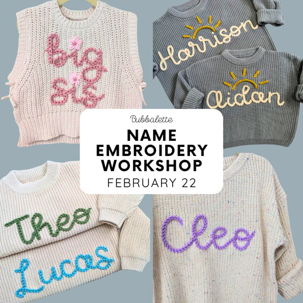 Join us for a beginner friendly workshop to learn how to embroider your very own name sweater 🪡 You will learn all the steps to embroider with yarn on knitwear from start to finish, as well as our tried and true tips to create the cutest keepsake sweaters around!